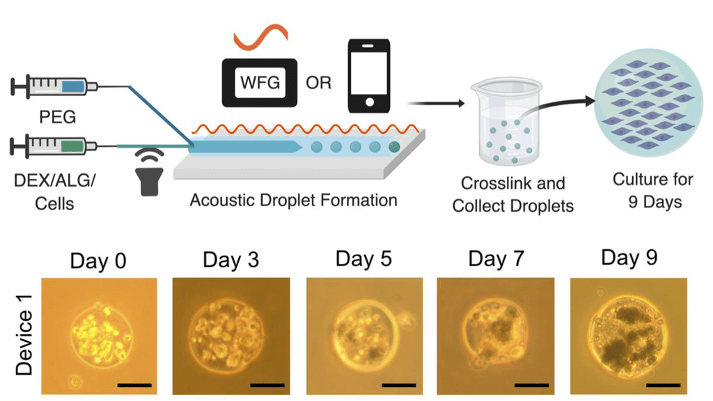 All-Water Bioengineered Systems Segregative liquid phase separation refers to the formation of two immiscible polymeric aqueous liquid phases where two polymers are in a soluble state with water, but phase separate from each other . This leads to an aqueous two-phase system (ATPS), where each phase is enriched in one or the other polymer. By combining ATPS and microfluidic technologies we create water-in-water emulsion droplets for bioengineered platforms. Engineered all-water systems include acoustofluidic fabrication of tumor-like spheroids within hydrogel microspheres and membrane free artificial cell compartments housing nucleoprotein organelles.